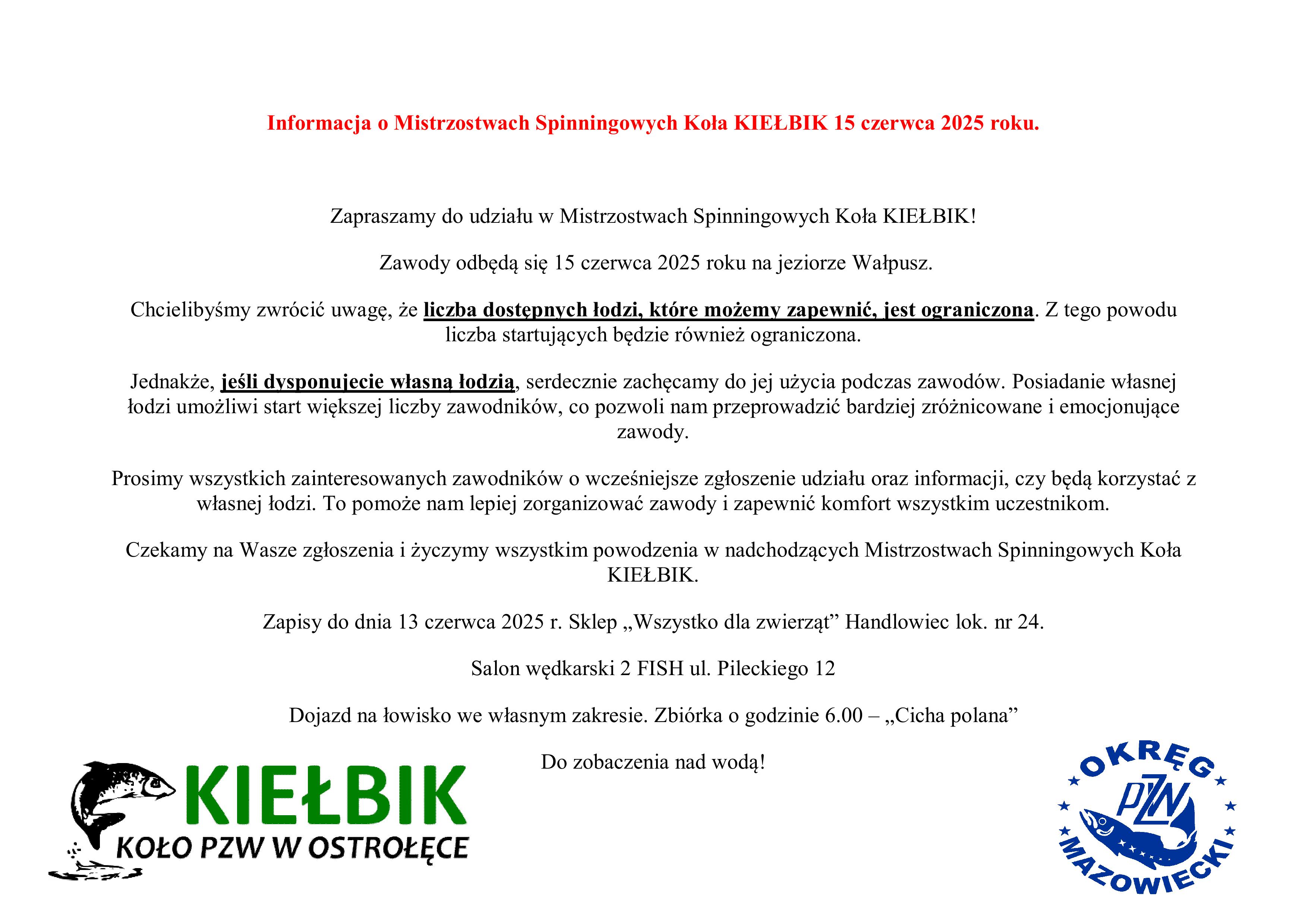 Relacja Spinningowe Mistrzostwa Koła KIEŁBIK 2025 – Jezioro Wałpusz, 15 czerwca 2025.