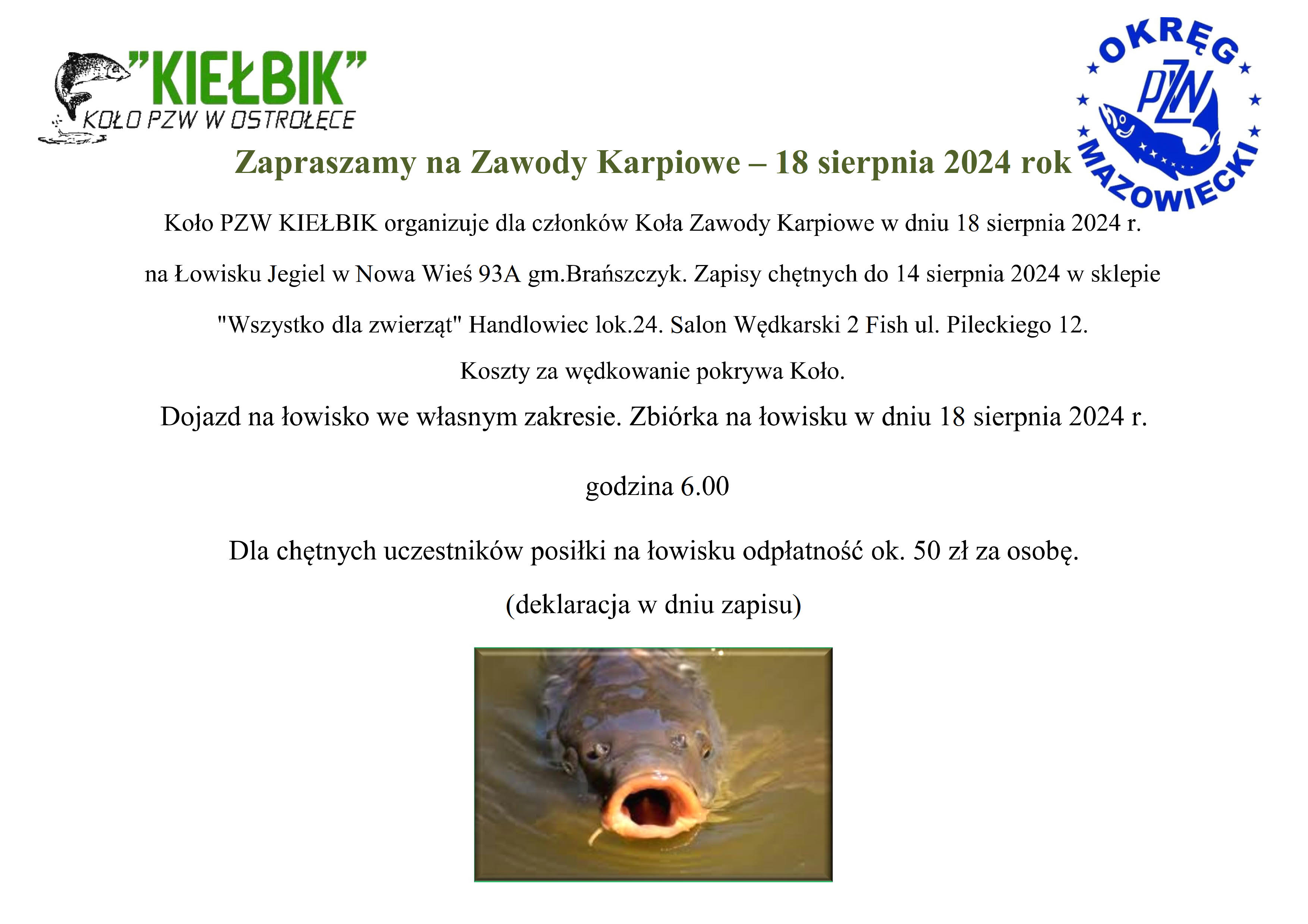 UWAGA ! Informacja dotycząca Otwartych Towarzyskich Zawodów Spinningowych „PUCHAR KIEŁBIKA” w dniu 6 października 2024 roku.