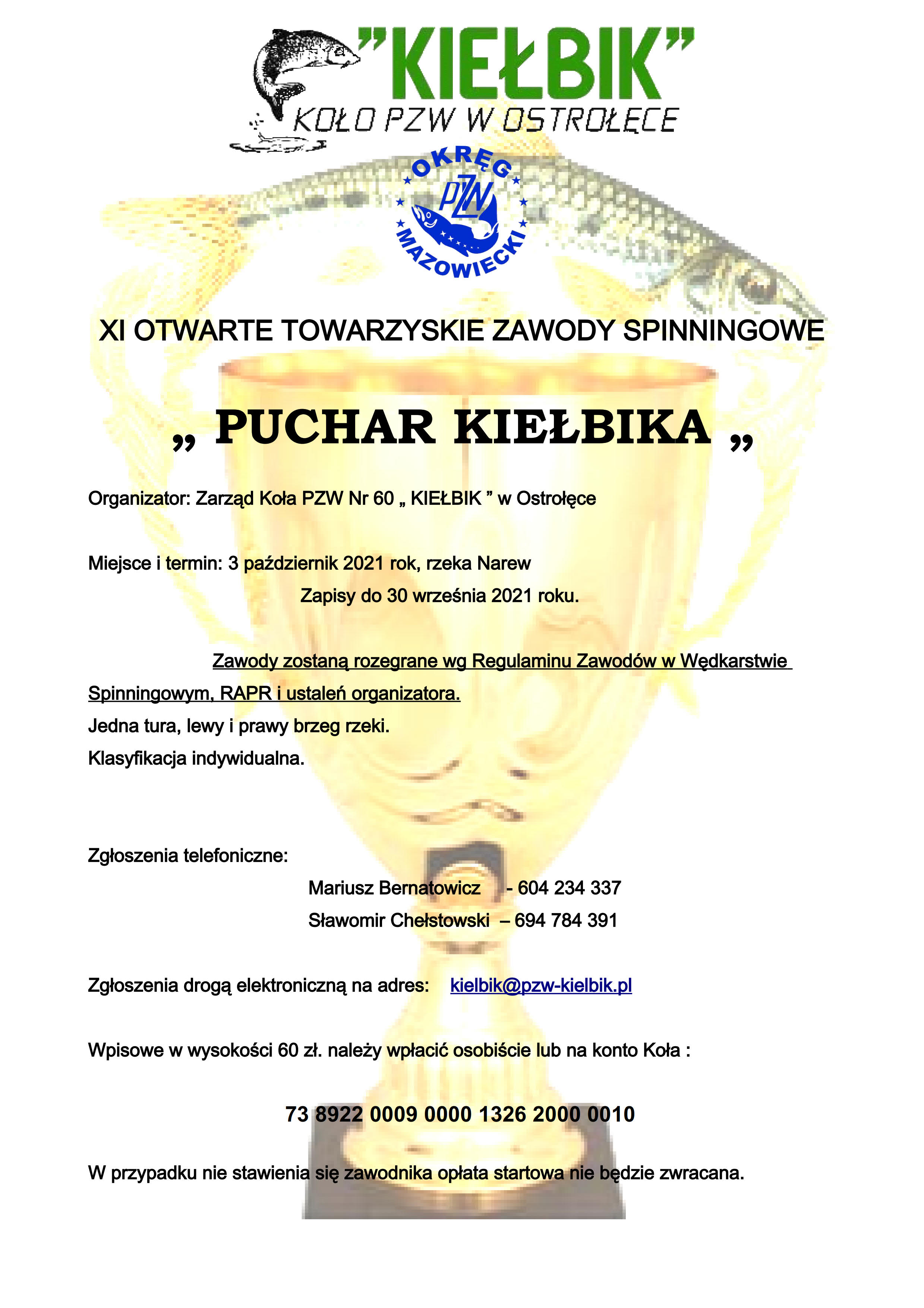 XI OTWARTE TOWARZYSKIE ZAWODY SPINNINGOWE „PUCHAR KIEŁBIKA”- 3 październik 2021 r. 16 wrzesień 2021 kielbikad01 Kategoria: Ogłoszenia