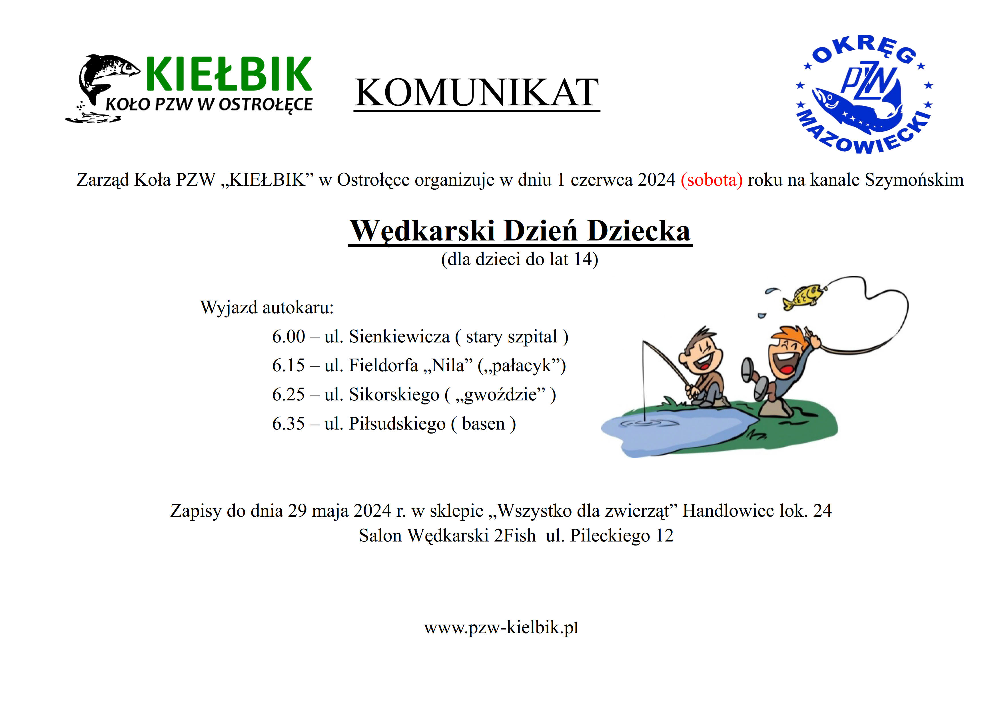 Informacja o Mistrzostwach Spinningowych Koła KIEŁBIK 16 czerwca 2024 roku.