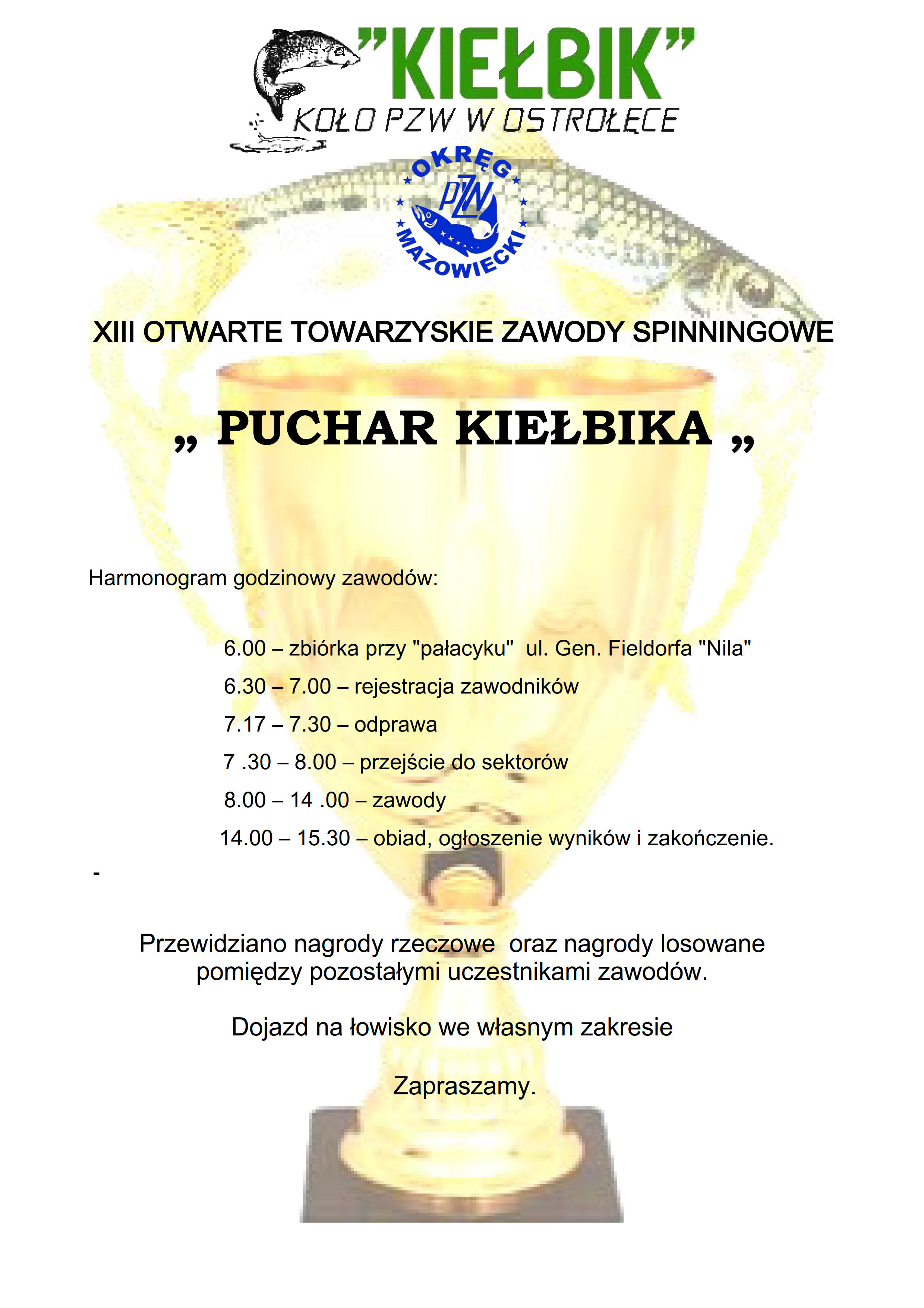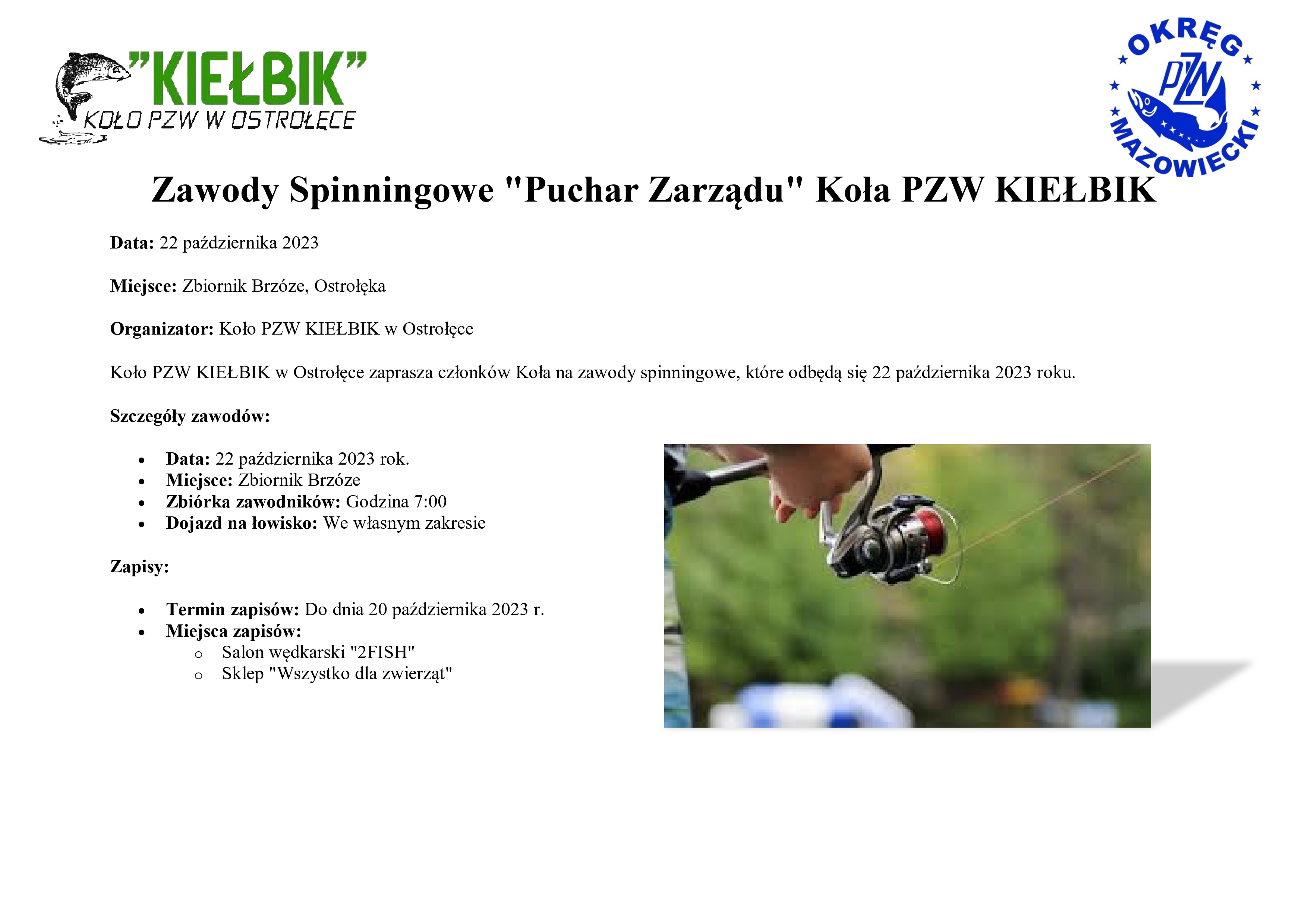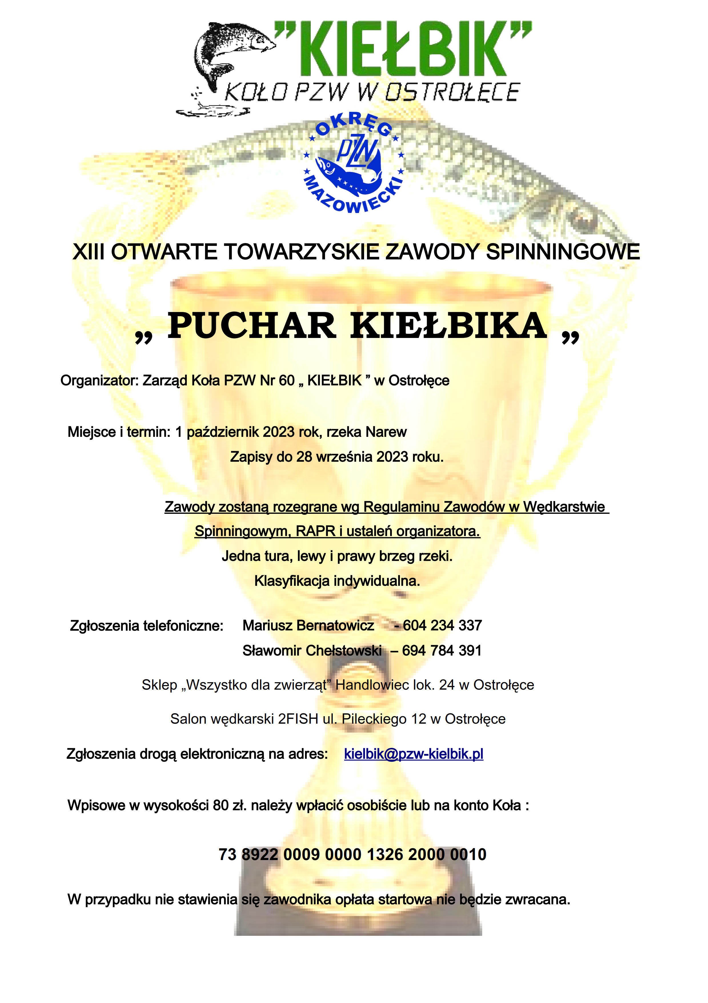 Koło KIEŁBIK serdecznie zaprasza wszystkich miłośników wędkarstwa na XIII Otwarte Zawody Spinningowe, które odbędą się w dniu 1 października 2023 roku na malowniczej rzece Narwi.