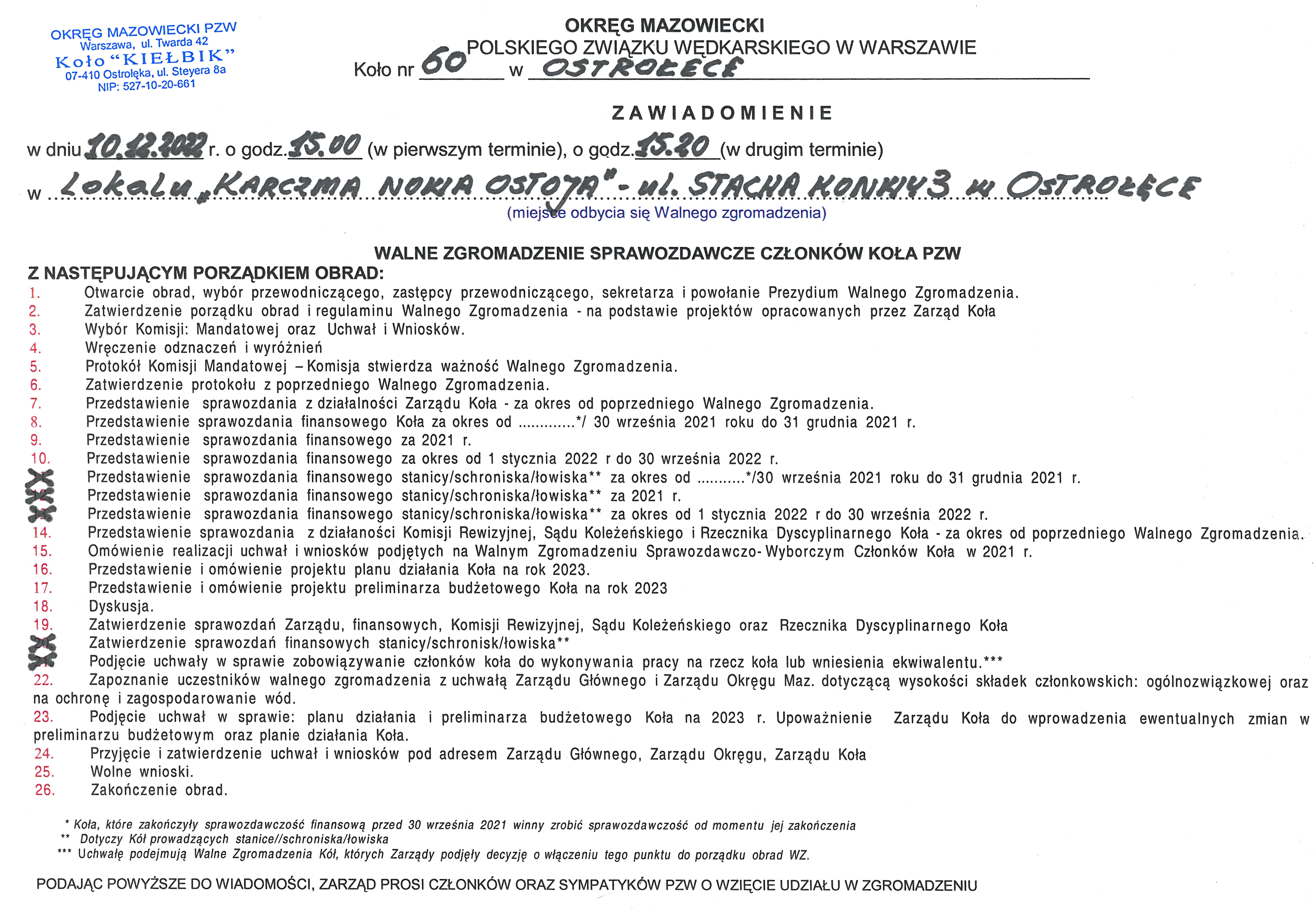 Walne Zgromadzenie Sprawozdawcze Koła KIEŁBIK – 10 grudnia 2022 rok. 16 listopad 2022 kielbikad01 Kategoria: Ogłoszenia