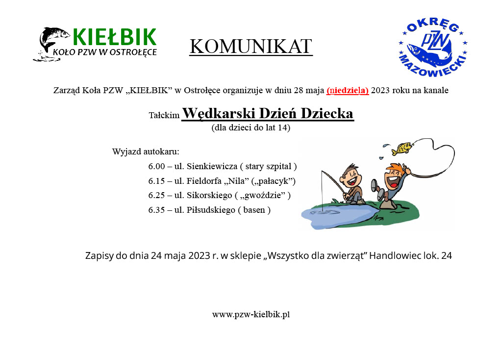 28 maja 2023 r. – Wędkarski Dzień Dziecka – kanał Tałcki. 24 kwiecień 2023 kielbikad01 Kategoria: Ogłoszenia