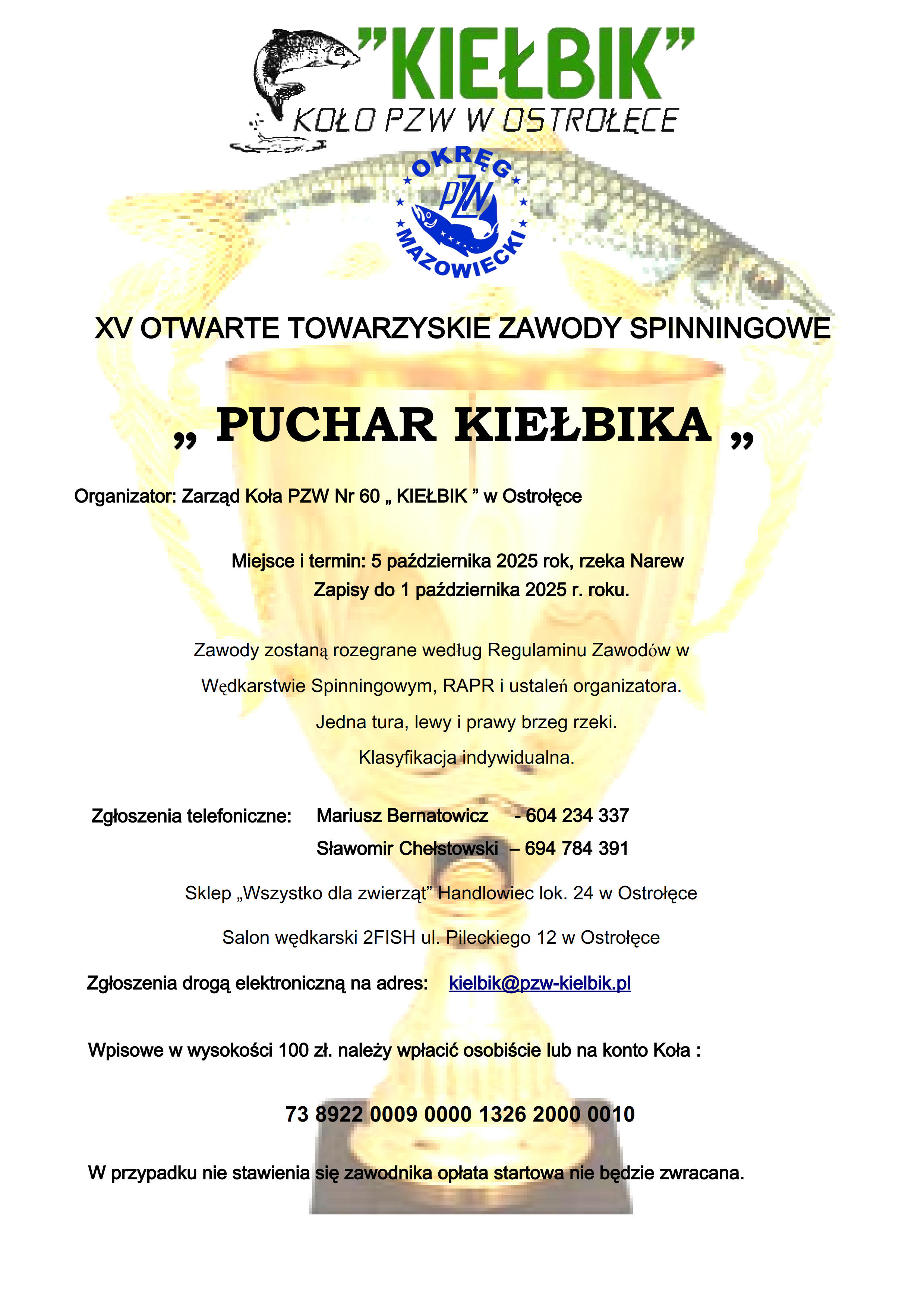 Zarząd Koła Wędkarskiego KIEŁBIK w Ostrołęce serdecznie zaprasza wszystkich miłośników spinningu do udziału w XV edycji Towarzyskich Zawodów Spinningowych o „Puchar KIEŁBIKA”, które odbędą się w dniu 5 października 2025 roku.